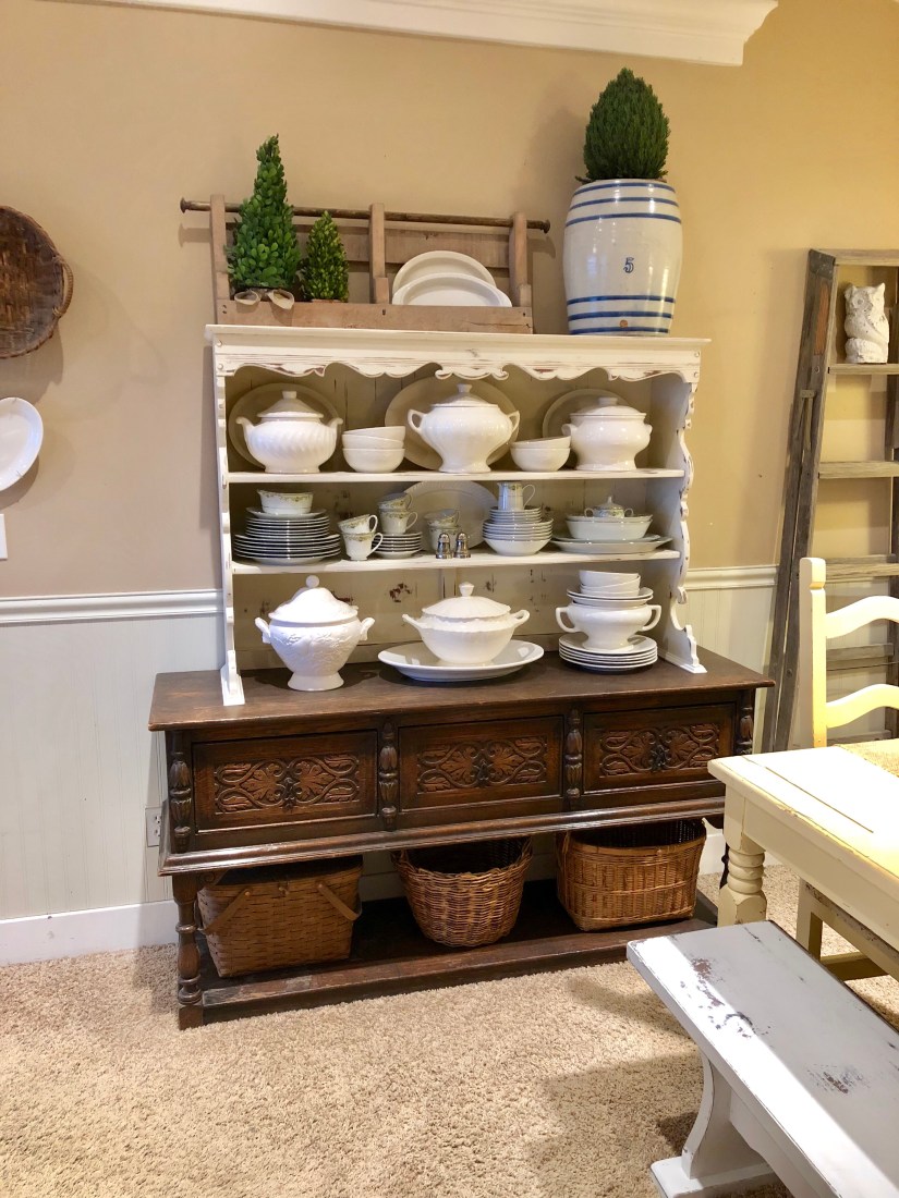 Good morning! It’s wet a dreary here! I love to putter around the house and move things around on days like this! I love the rain! This piece is two separate items “Frankensteined” together. The top was a find from my sweet friend, the bottom is my moms. It’s an antique from San Juan Capistrano , our favorite place to vacation as a family. I love to piece items together that aren’t made to go together. It makes life interesting! The dishes on the middle shelf are my moms also 🙂 family items make my heart happy ❤️