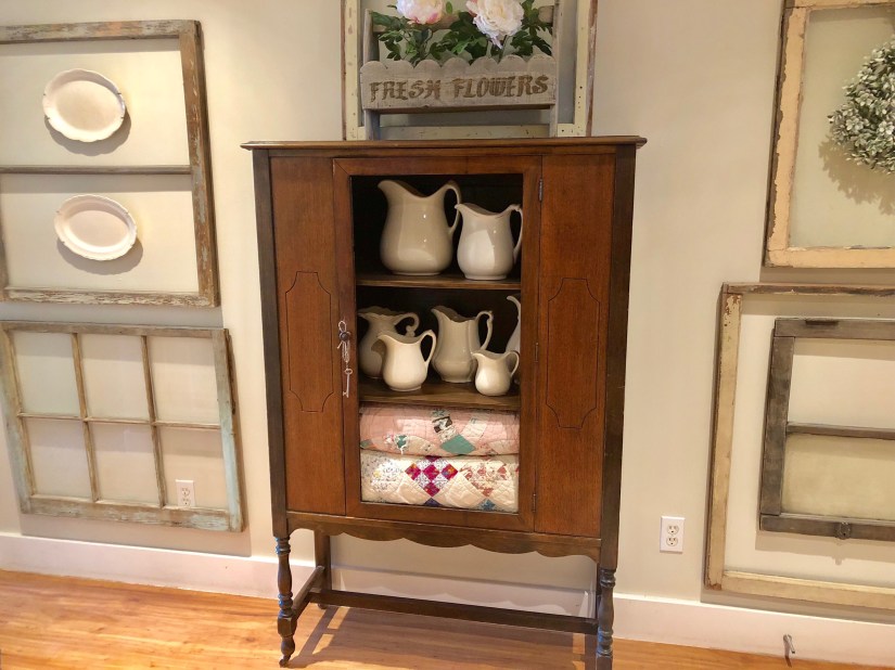 Good morning! This is my entry… it changes frequently because I can’t keep things the same for very long 😉 I love my old windows! They are all from thrifting and a couple were from a friend. The plates inside the one in the left are family pieces. The top one was my great grandmas, the bottom is my moms. I collect white pitchers, I’m obsessed with them! These are all thrift store finds. The top quilt in the cabinet was my grandmas, the bottom is yet another thrifty find. Your entryway should reflect you and set the stage for the rest of your home… or so they say. I say do what you love ❤️