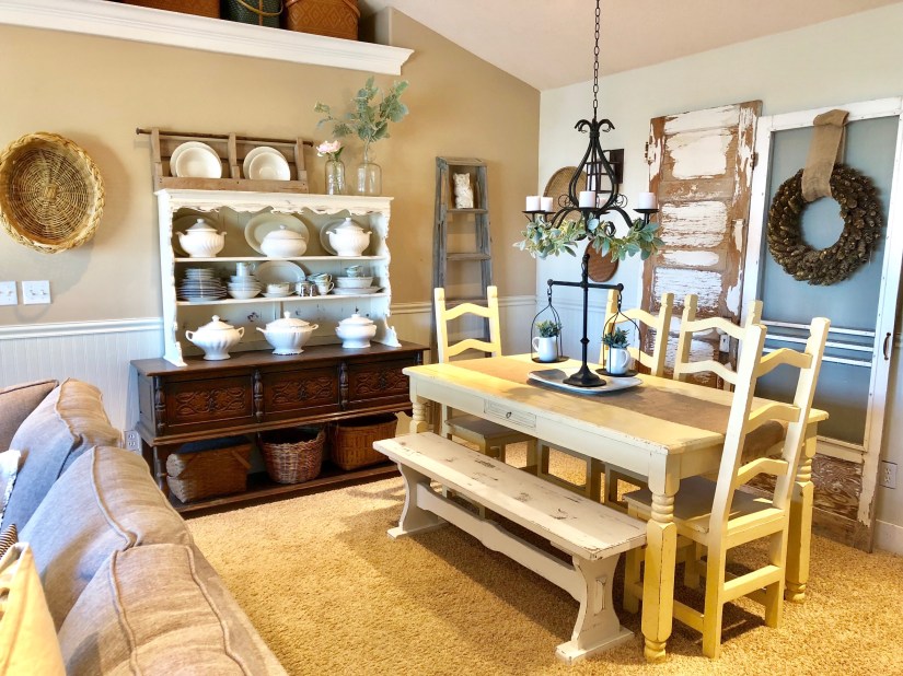Good morning! This is a view of my dining room area. My table is in desperate need of a new coat of paint! It’s a buttery yellow now. I painted it about 7 years ago. I’m ready for a change but not sure on a color… my first instinct says cream/white. Give me suggestions 🙂