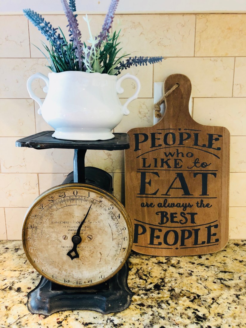 Good morning! My kitchen decor changes frequently… just like the other rooms in my house π I have a hard time keeping things looking clutter free so I have counter space, and decorating. Anyone else? I love old scales, who doesn’t π I found this one at a thrift store. The cutting board is from Walmart. I love the saying in it… so very true!!! Have a great day