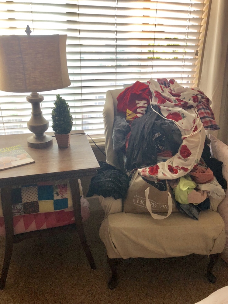 Good morning! Monday’s here already…. I hope you all had a beautiful weekend 🙂 So here is my real day # 3… I refinished this chair. It was a ton of work! But it seems like it’s only purpose is to hold my clean clothes pile. I don’t have a hard time washing and drying. But folding and putting it away is another story 🙃 I’ve loved seeing your real rooms! Keep posting pictures! This photo is a little hard to see… the window. Have a great day! Maybe I should put all this away, but maybe not