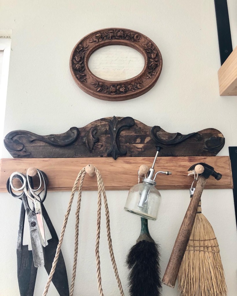 I love salvage wood pieces 🤍 this lovely came off a mirror. It fits on top of my coatrack perfectly 🤍 #salvagedwood #salvage #old #fallingapart #perfectlyimperfect #kitchen #oldbrushes #farmhousedecor #antique #antiquesalvage #handmedowncottage #furnitureattiffanys
