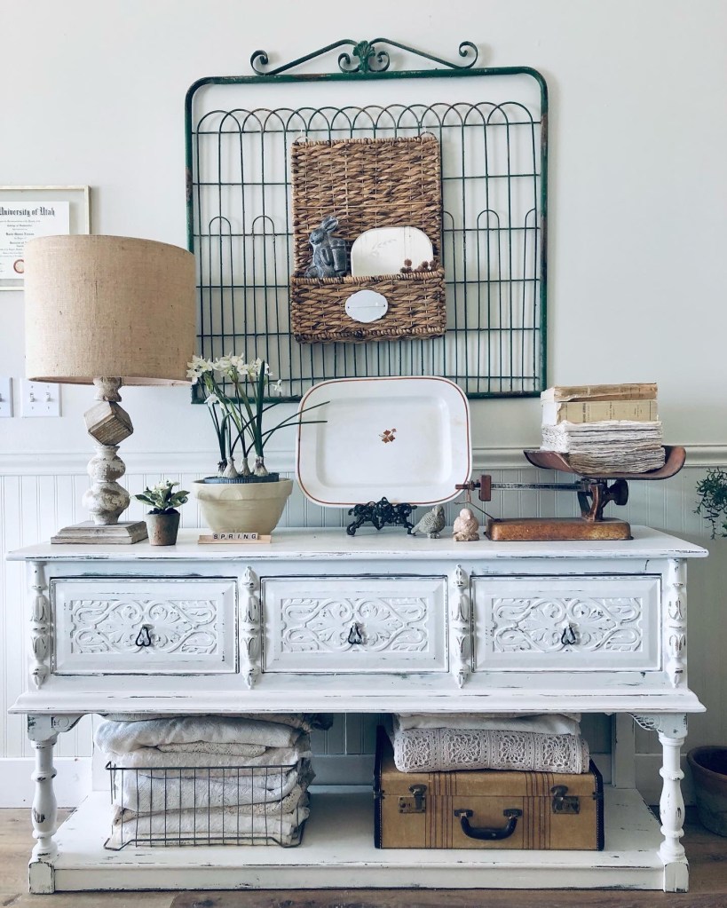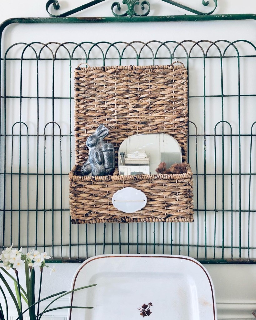 I found this basket organizer while thrifting yesterday… I love it hanging on my gate over my buffet! I also found the antique mirror I have in one of the compartments 🤍 What do you think? #basket #thriftstorefinds #deseretindustries #oldmirror #spring #bunnymold #ironstone #oldgate #paintedfurniture #mymomsbuffet #antiquebuffet #vintage #farmhousedecor #vintagelinens #oldlace #oldsuitcase #handmedowncottage #furnitureattiffanys
