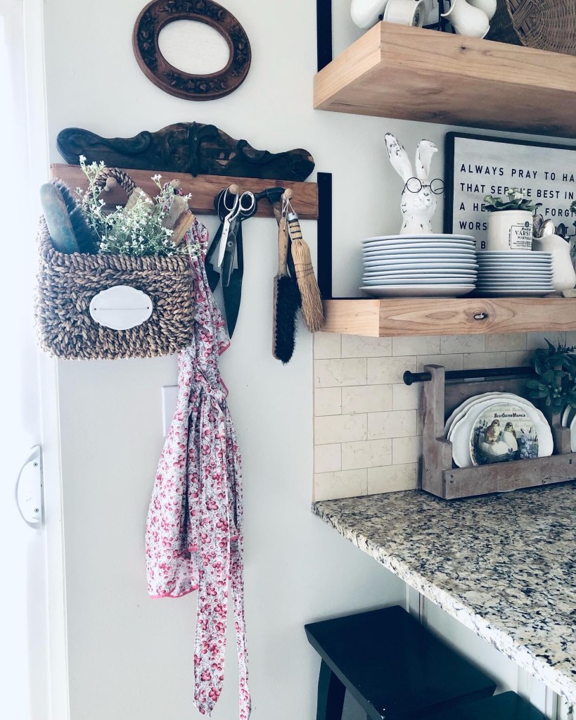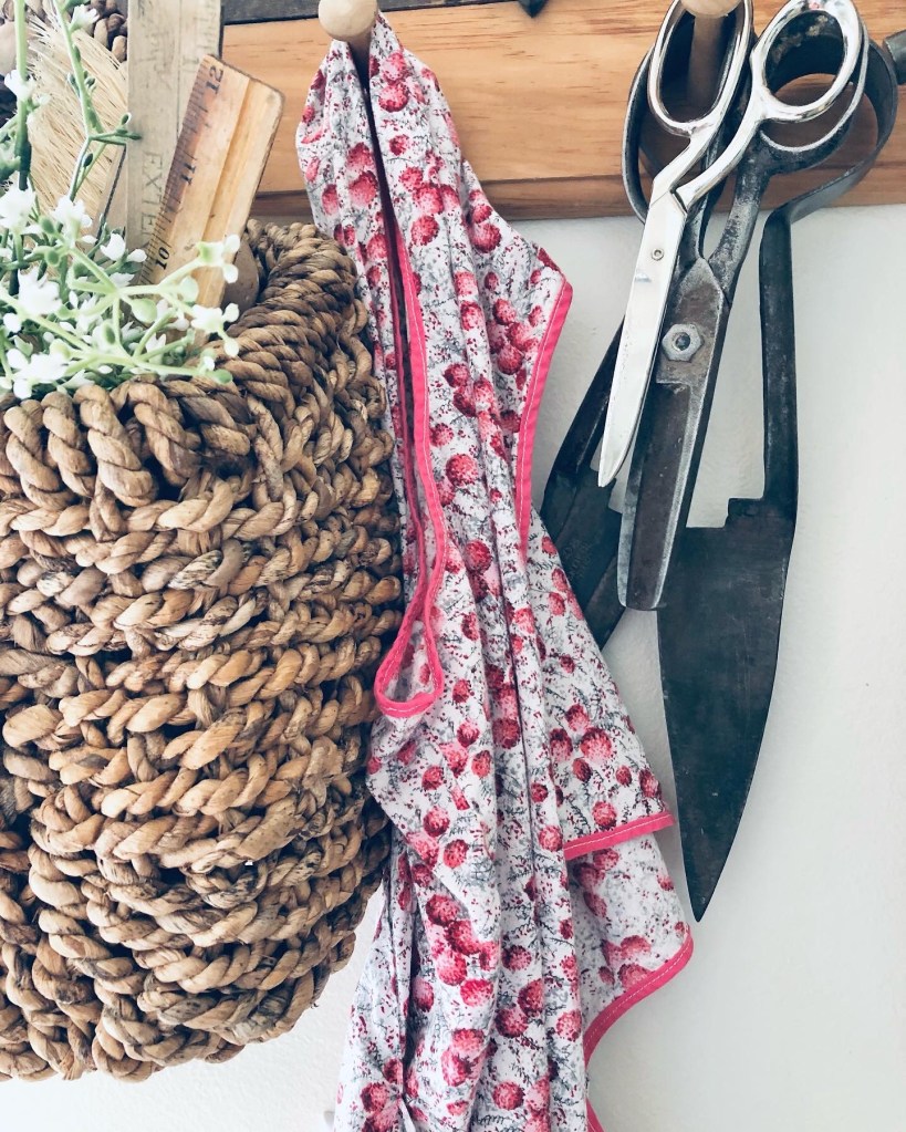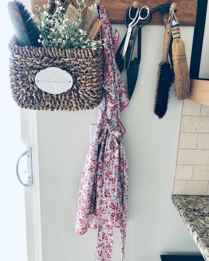 How sweet is this vintage grandma apron?! I found her at #saversthriftstore and had to bring her home! I tried it on and my daughter told me I just aged myself 40 years ππ Well I love old grandma things, I canβt help it! Have a happy Monday π #apron #floral #vintage #grandma #grandmasapron #isntitcute #kitchen #hooks #ironstone #oldscissors #antiques #handmedowncottage #furnitureattiffanys