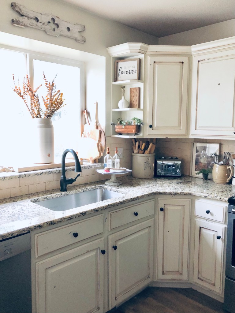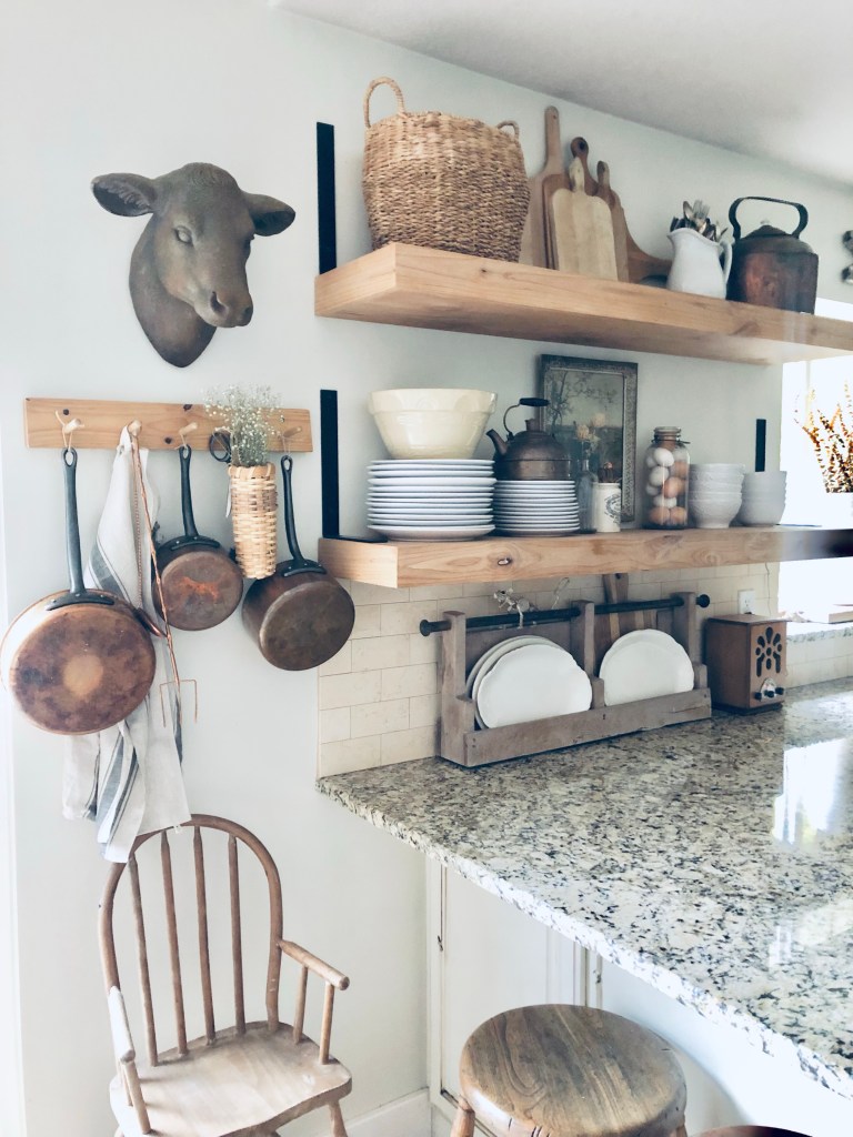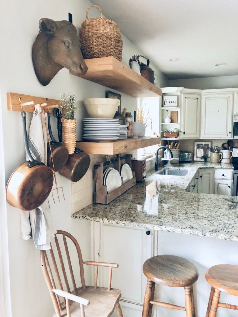When it’s ugly out, I get inspired to clean and redecorate… anyone else? My kitchen is the victim today 🤍 Stay warm friends! #kitchen #farmhousekitchen #farmgousedecor #kitchenshelves #ironstone #fallsnow #itscoldoutside #octobersnow #alreadyreadyforspring #copperpots #antiques #cleanforaminute #handmedowncottage #furnitureattiffanys