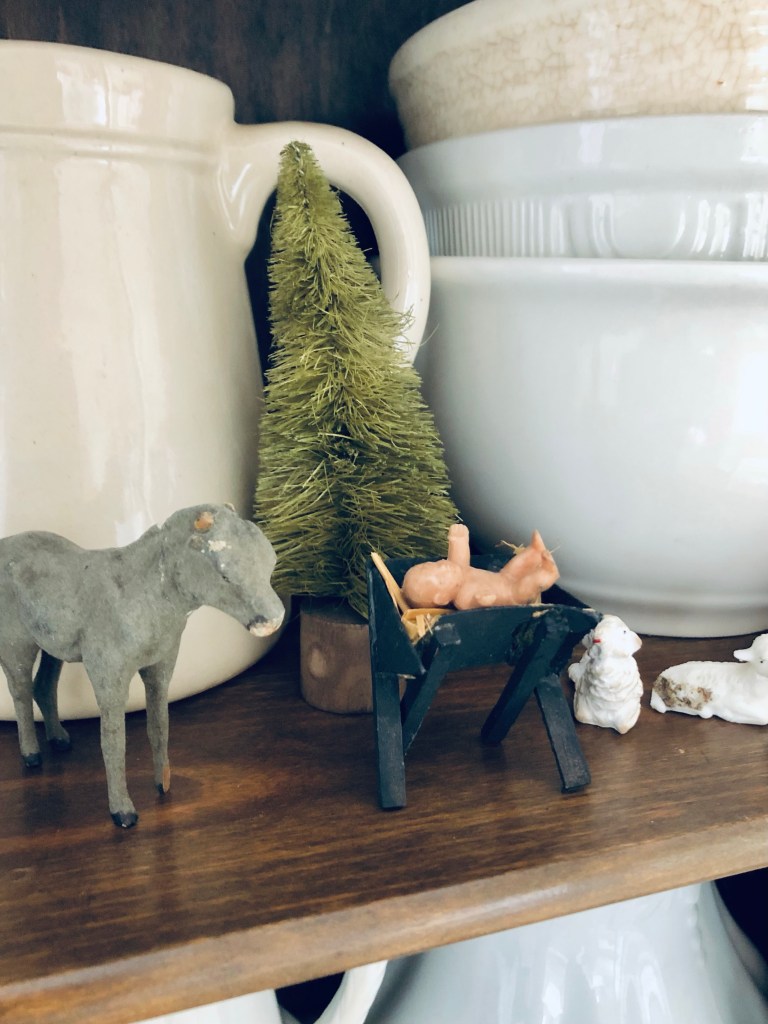 Started adding my small #putz collection to my hutch for Christmas 🤍🎄 How cute is that tiny baby Jesus? ❤️ #putzcollection #putzhouse #putzsheep #nativity #antique #ironstone #ironstonecrushin #ironstonecollection #handmedowncottage #furnitureattiffanys
