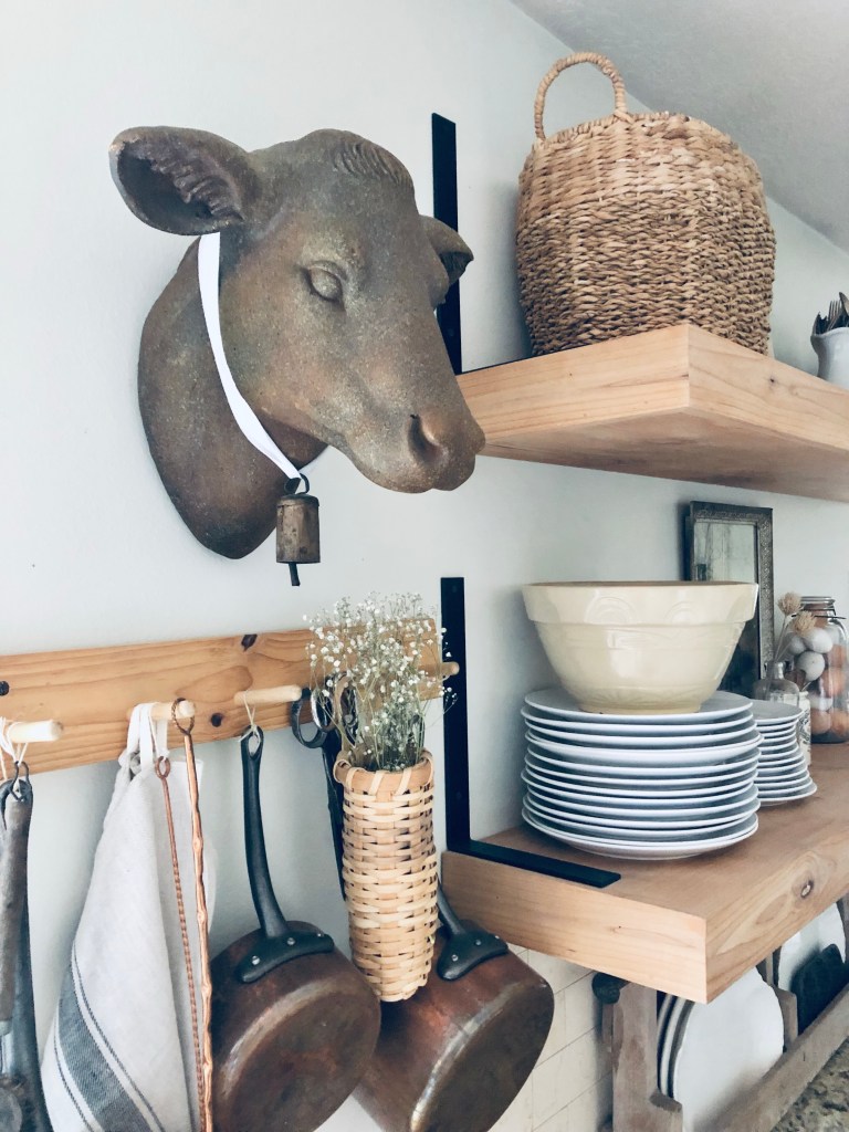 Patty the cow got a bell 🐄 #cow #farmhousestyle #readyforchristmas #cowbell #kitchendecor #farmhousekitchen #happymonday #whitedishes #kitchenshelf #handmedowncottage #furnitureattiffanys