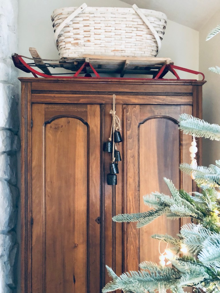 Happy Saturday ❤️ #christmasdecor #2022 #bells #antiquewardrobe #oldsled #oldbasket #saturdayvibes #handmedowncottage #furnitureattiffanys