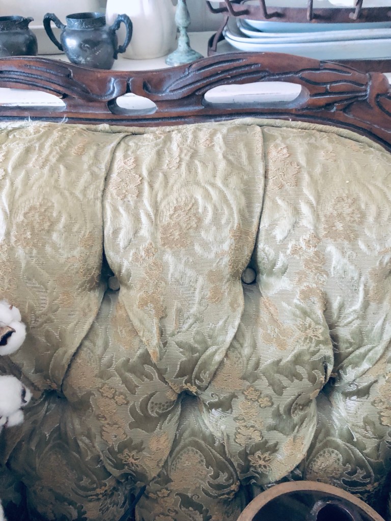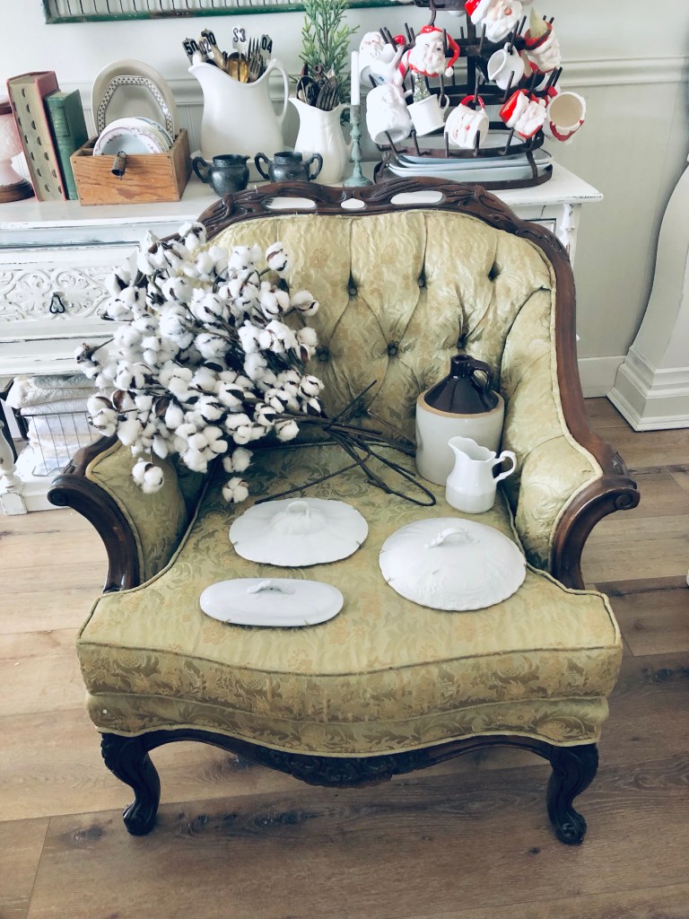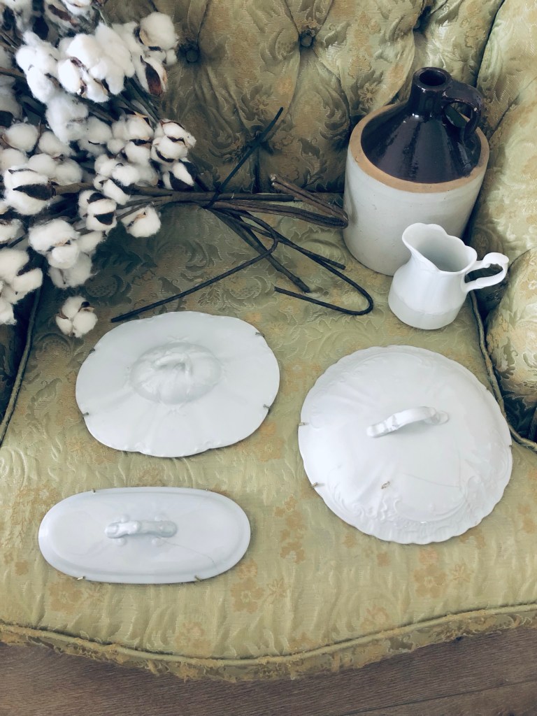 I found the sweetest old chair thrifting today and I just couldn’t leave her behind 🤍 I’m thinking I may deconstruct her… what do you think?? Also, few items give me goosebumps but when I happened upon these antique ironstone lids I almost cried! Aren’t they fabulous? I also found a sweet little ironstone creamer, an antique stoneware jug and a huge lot of cotton stems 🤍 Not much out there today but I think I did alright! #thriftstorefinds #deseretindustries #difinds #oldchair #ironstone #saturday #happythrifting #handmedowncottage #furnitureattiffanys