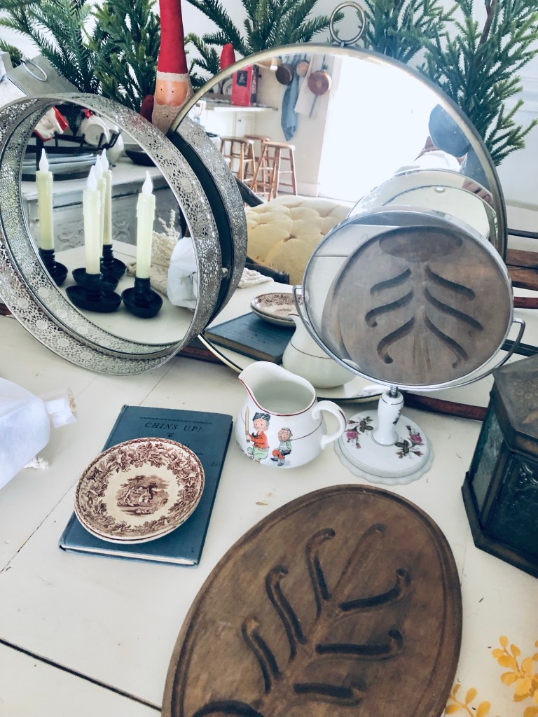I braved the roads and went thrifting today… here are my finds ❤️ What would be your fav? It’s a tie between the old book and old transfer ware plates ❤️ Couldn’t you just live in that little house that’s on them?! #thriftstorefinds #deseretindustries #vintagechristmasdecor #mirrors #oldbooks #thrifting #thriftingistherapy #handmedowncottage #furnitureattiffanys