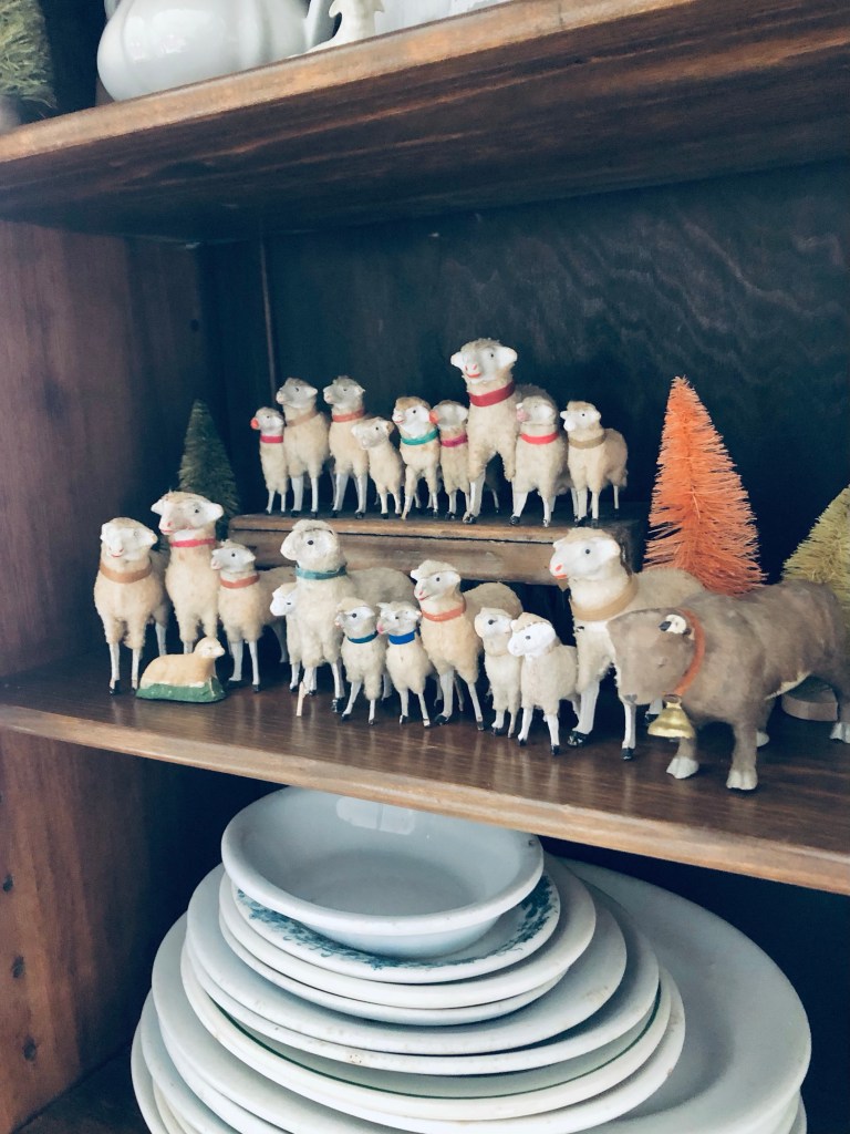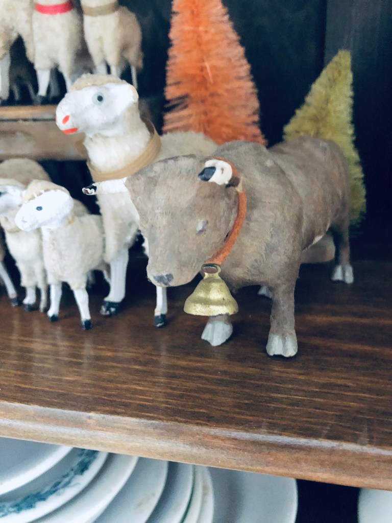 I’m not sure the sheep are thrilled with their new friend 🐂 But I think that once they get to know him, they will love him as much as I do 🤍 #putz #putzsheep #cow #antique #bull #isnthecute #newfriends #ironstone #christmasdecorations🎄 #handmedowncottage #furnitureattiffanys #vintage #farmhousechristmas