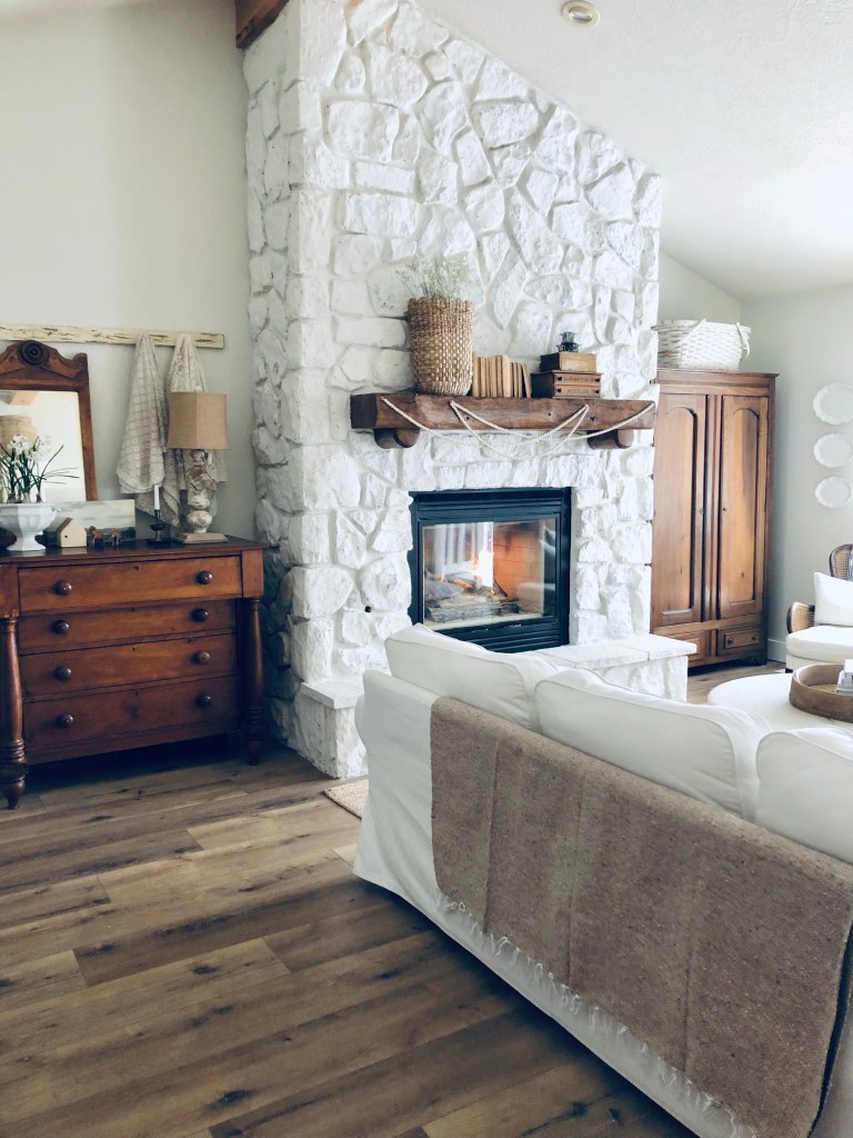 Happy Wednesday 🤍 #christmasdecorisdown #cleanslate #newyear #paintedfireplace #whitedecor #woodandwhite #whitecouch #familyroom #homedecor #vintage #antiquefurniture #handmedowncottage #furnitureattiffanys