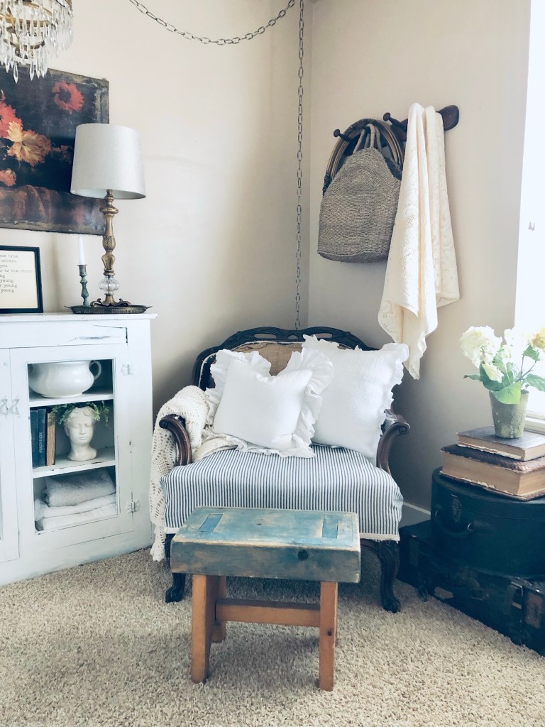 Happy Friday 🤍 I’ve been messing around with my new office/hang out room. It’s fun to rearrange and then do it again 😂Anyone else that can’t stop messing with their decor? Or is it just me?! #homedecor #office #vintagedecor #deconstructedchair #antiques #corner #friday #ihaveproblems #handmedowncottage #furnitureattiffanys