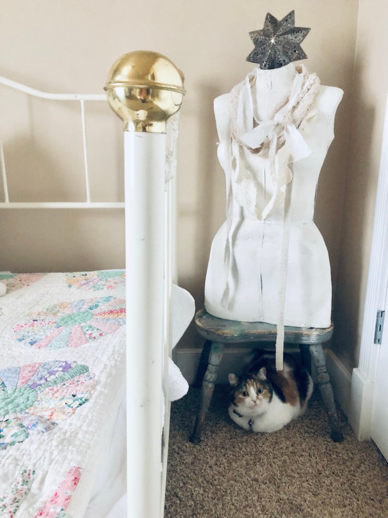 Happy Saturday 💗 #steviethegirlkitty #hiding #cat #cats #catsofinstagram #calico #calicocat #vintage #quilt #saturdayvibes #handmedowncottage #furnitureattiffanys