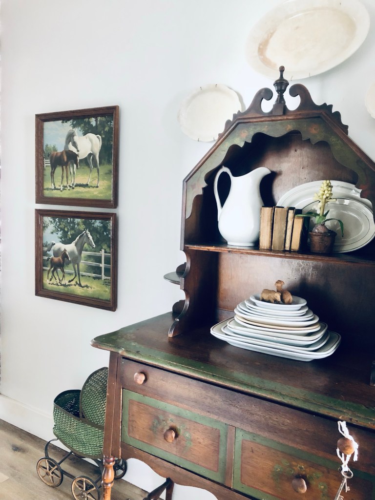 I hung the vintage paint by numbers I found last week thrifting 🤍🐴 I adore them! #vintagepaintbynumber #horse #horses #vintageart #entrywaydecor #lovethem #antiquecabinet #ironstone #handmedowncottage #furnitureattiffanys #thriftedart #thriftstorefinds #deseretindustries