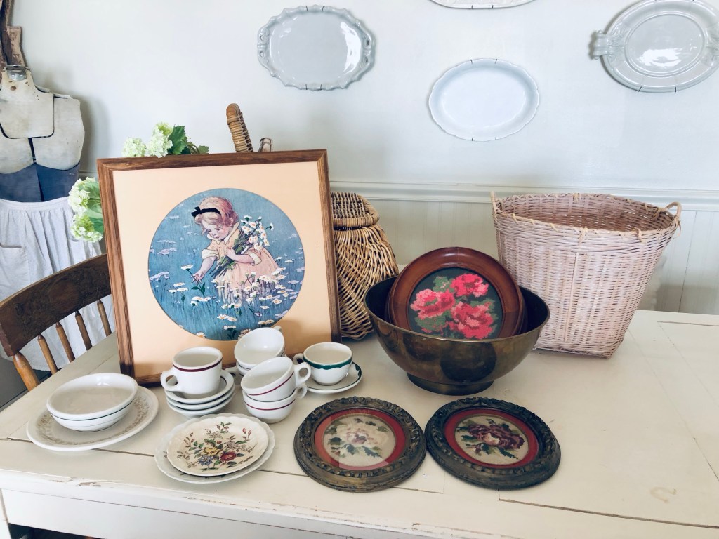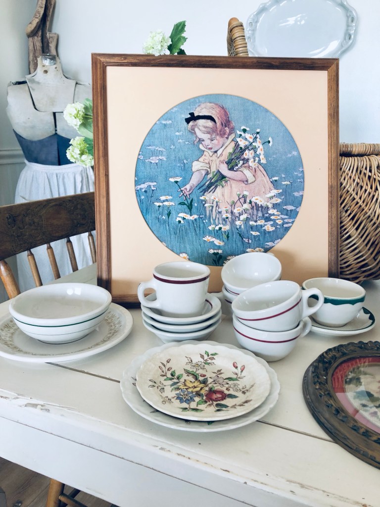 My little thrift haul from today 💗 there was a floral art and pink theme today! Haha! What would be your fav? Mine are the restaurant ware dishes… I’m kinda crushing on those lately! #thrift #thrifting #thriftstorefinds #deseretindustries #florals #artwork #handmade #vintagerestrauntware #pink #basket #brassbowl #handmedowncottage #furnitureattiffanys