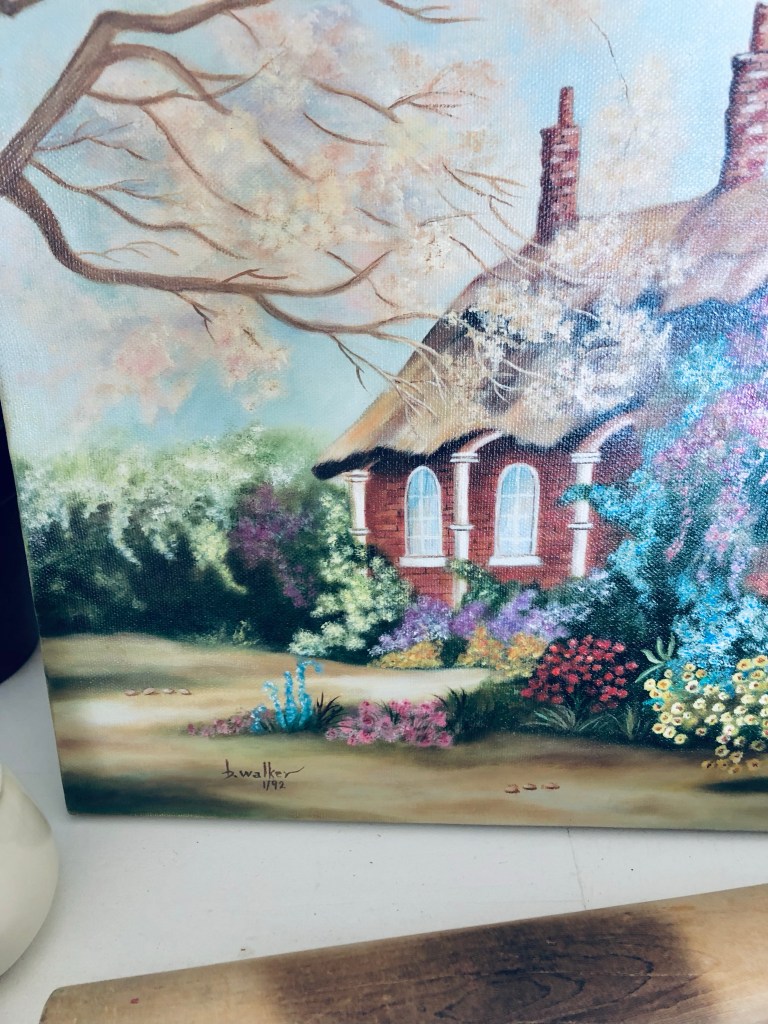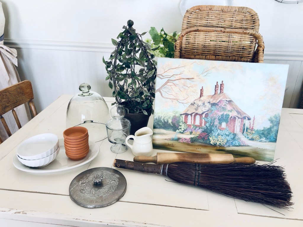 My small haul today 🤍 I didn’t find much, but seriously how sweet is that painting?! I would love to live there, wouldn’t you? #thriftstorefinds #antiquing #therapy #vintage #originalart #deseretindustries #ironstone #whiskbroom #handmedowncottage #furnitureattiffanys