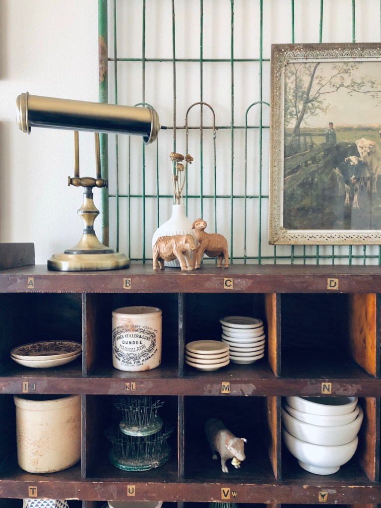 Happy Saturday 🤍 I thrifted this little brass bankers lamp a few months ago. I am a lamp hoarder! Can’t get enough of them! What is one item you can never have enough of? #hoarder #lamps #thrifted #thriftstorefinds #vintage #brass #farmhousedecor #vintagemailsorter #ironstone #saturdayvibes #handmedowncottage #furnitureattiffanys