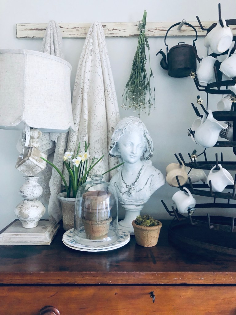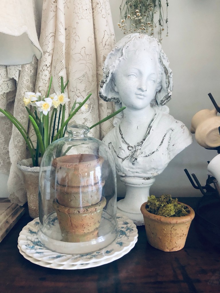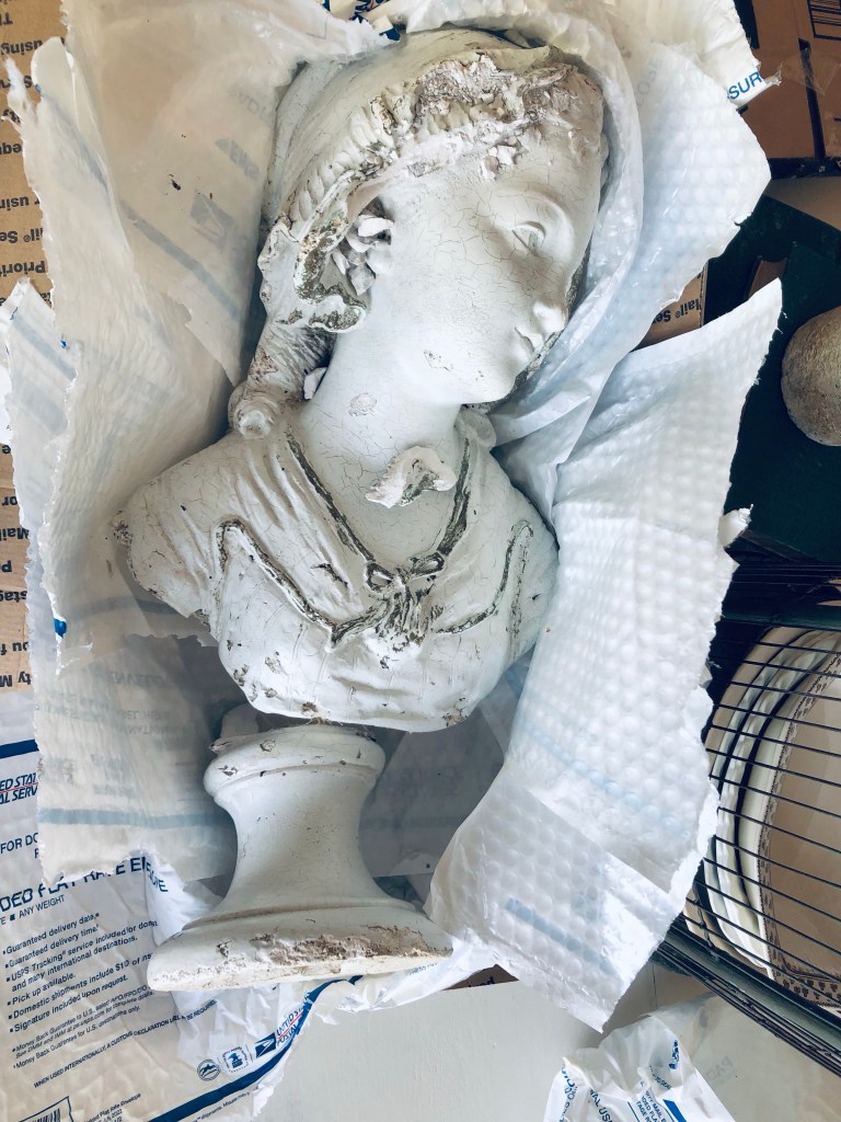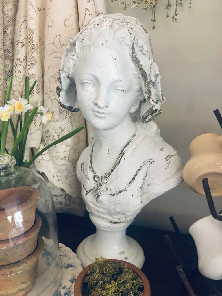 Good morning! I got happy mail yesterday that wasn’t so happy… this sweet gal arrived to me broken 😭 I pieced and glued her back together. I love her, broken and all 🤍 #antique #statue #buststatue #cracked #broken #imperfect #french #frenchbust #isntshelovely #handmedowncottage #furnitureattiffanys