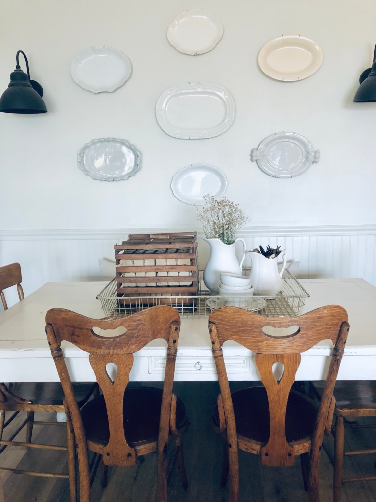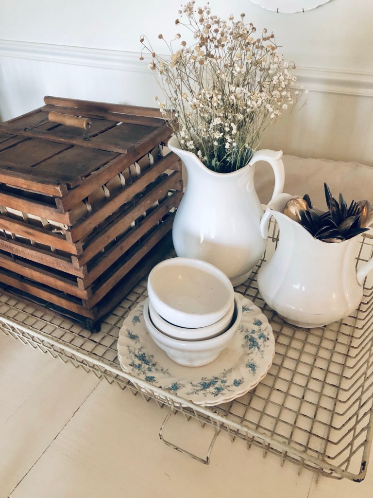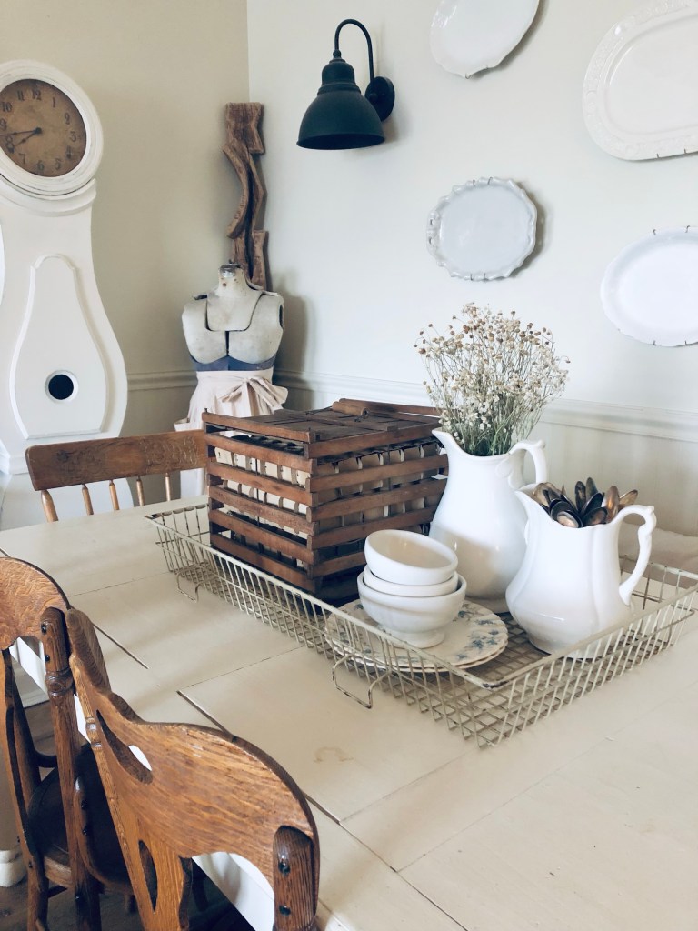 I found this huge wire tray thrifting today… I’m not 100% what it’s original use was, but I love it styled on my dining table 🤍 #thrifting #vintage #styling #diningtabledecor #ironstone #eggholder #antique #deseretindustries #handmedowncottage #furnitureattiffanys