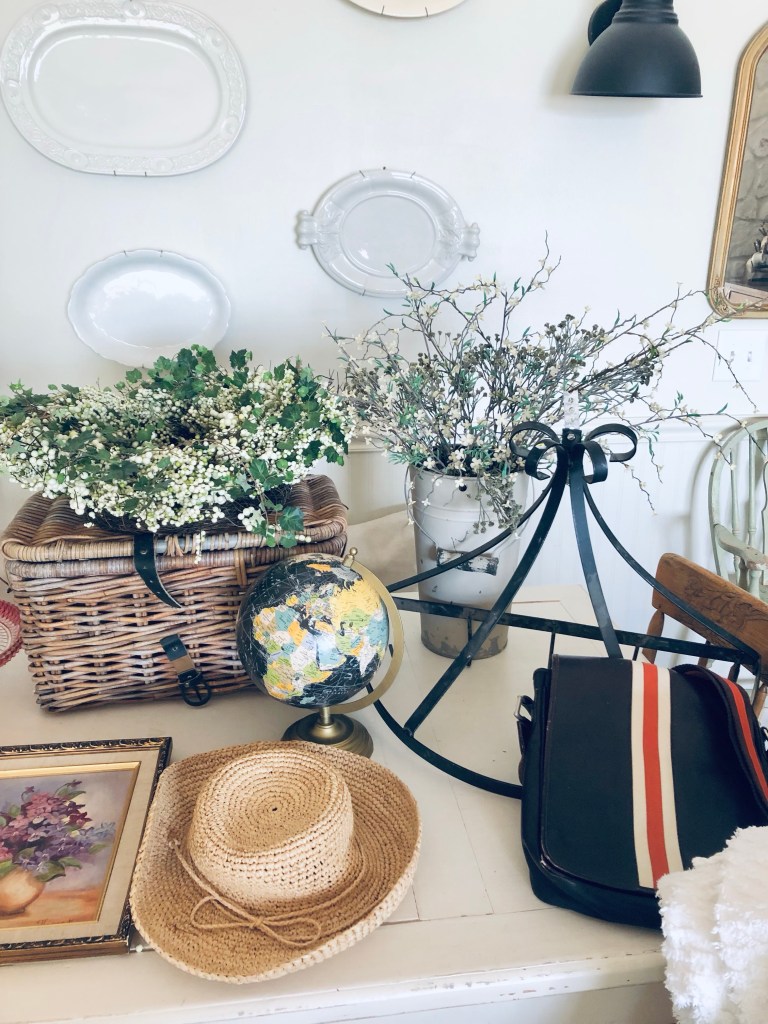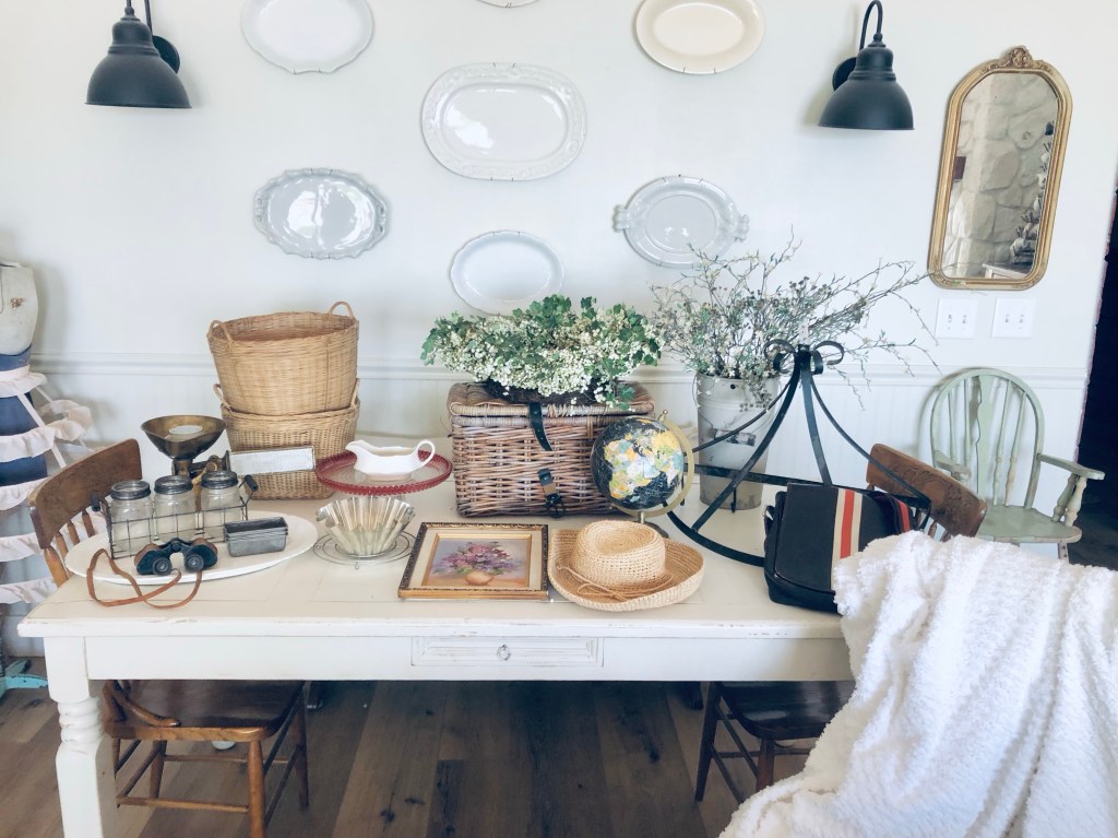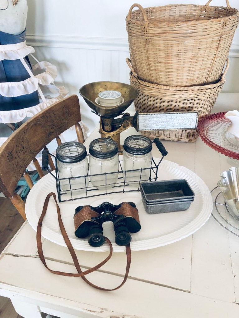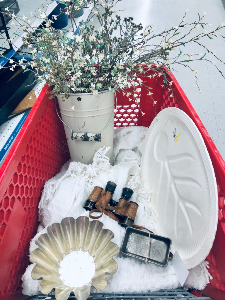 My thrift store finds today 🤍 To be fair… I picked up a couple marketplace finds today too. Can you guess which ones? #deseretindustries #savers #cartshot #vintage #antique #thriftstorefinds #ironstone #oldbaskets #chenille #antiquescale #antiquebonoculars #handmedowncottage #furnitureattiffanys