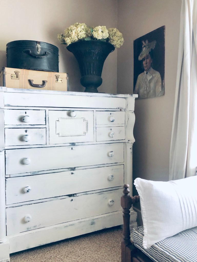 Happy Saturday 🤍 #saturday #saturdayview #masterbedroom #antiques #antiquefurniture #paintedfurniture #oldsuitcase #frenchdecor #portrait #painting #handmedowncottage #furnitureattiffanys