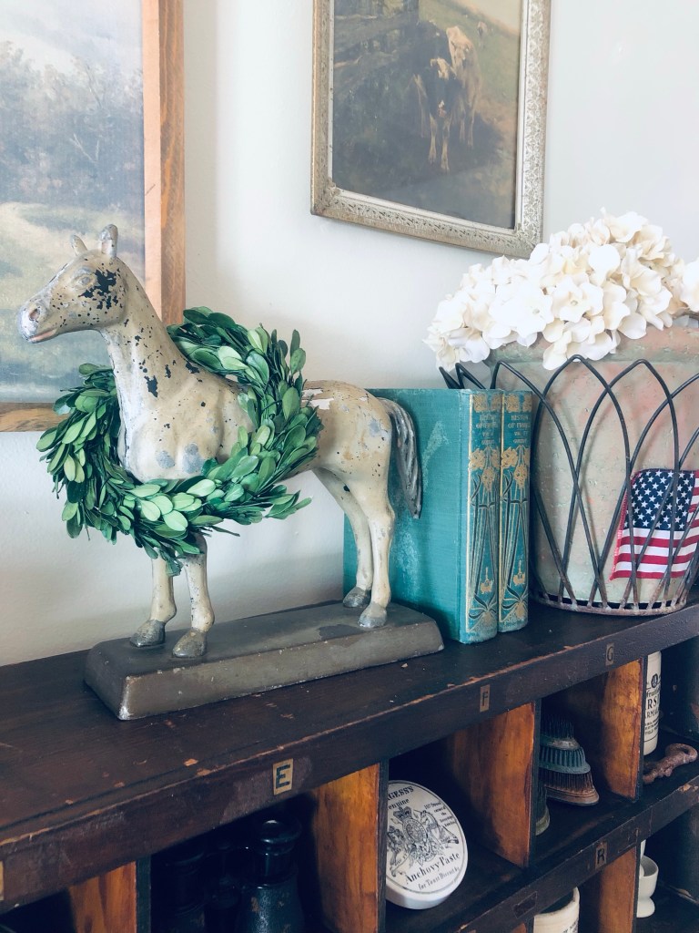 He looks like he won the Kentucky Derby π±πΉπΏπ·π #vintagehorse #castiron #sunday #kentuckyderby #homedecor #summervibes #wreath #frenchbooks #handmedowncottage #furnitureattiffanys