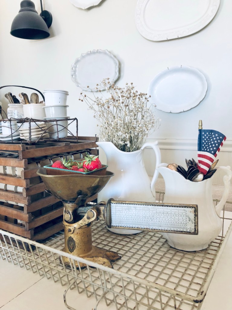 It’s hard to believe the 4th of July is this week!!! Summer is slipping by too fast 🇺🇸❤️🤍💙 #4thofjuly #summer #july #already #homedecor #america #farmousestyle #ironstone #antiques #oldscale #antiquescale #silverware #stawberries #handmedowncottage #furnitureattiffanys