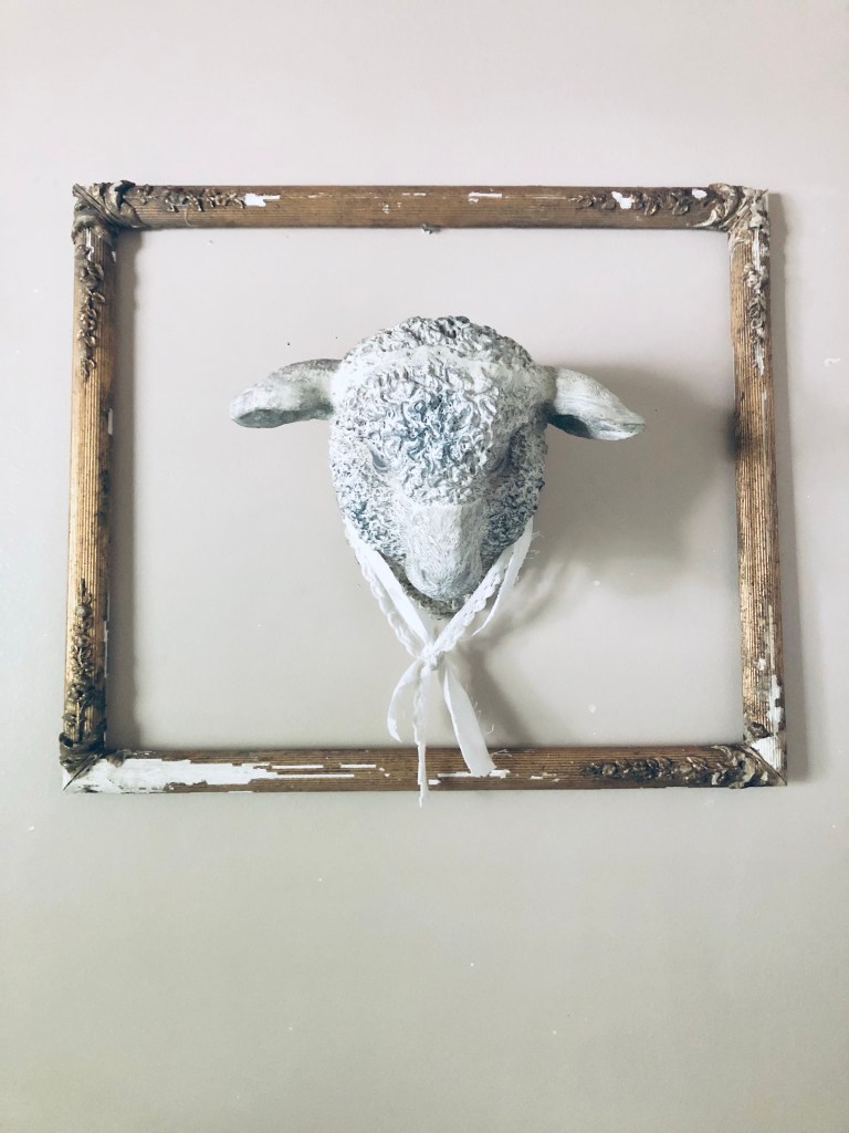 How sweet is this sheep I bought from my friend @thewhiteishstudio ๐๐ค What should we name her? #sheep #farmhousedecor #antiqueframes #name #vintage #pillows #myhangout #handmedowncottage #furnitureattiffanys