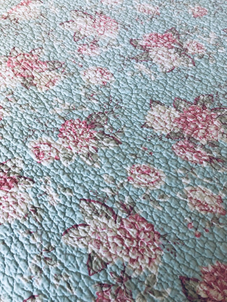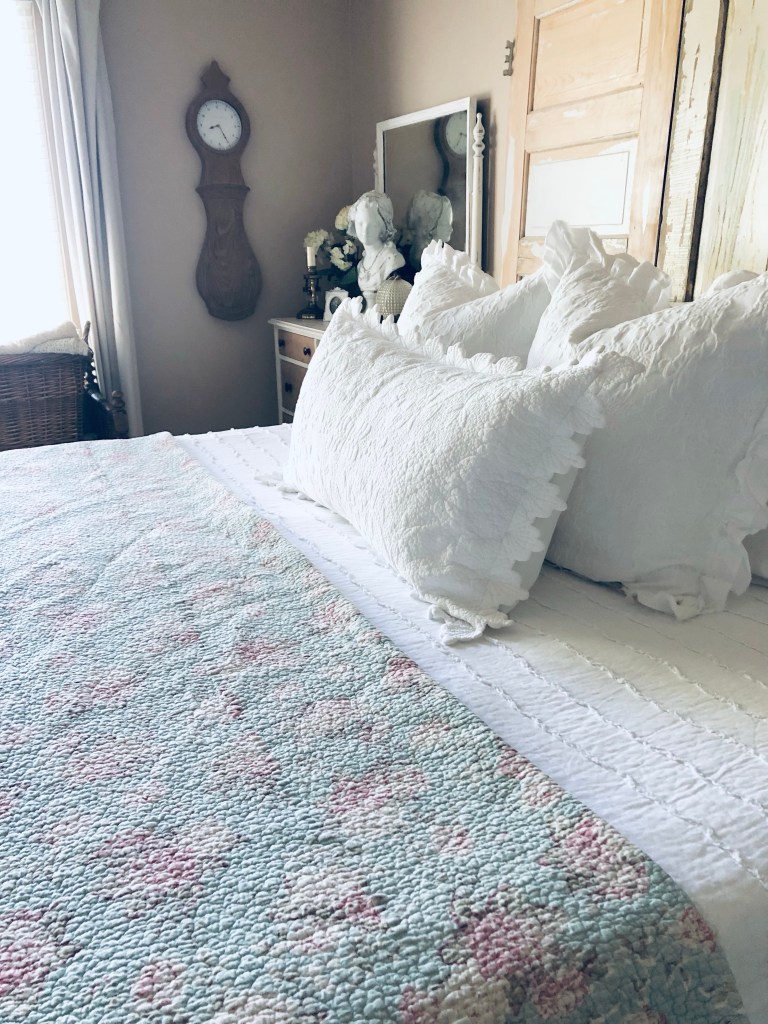 I found this sweet quilt thrifting on Saturday… the colors are just so perfect 🤍💗💙 #thriftstorefinds #quilt #mutted #pink #blue #cream #love #olddoors #headboard #white #ilovethrifting #happymonday #handmedowncottage #furnitureattiffanys