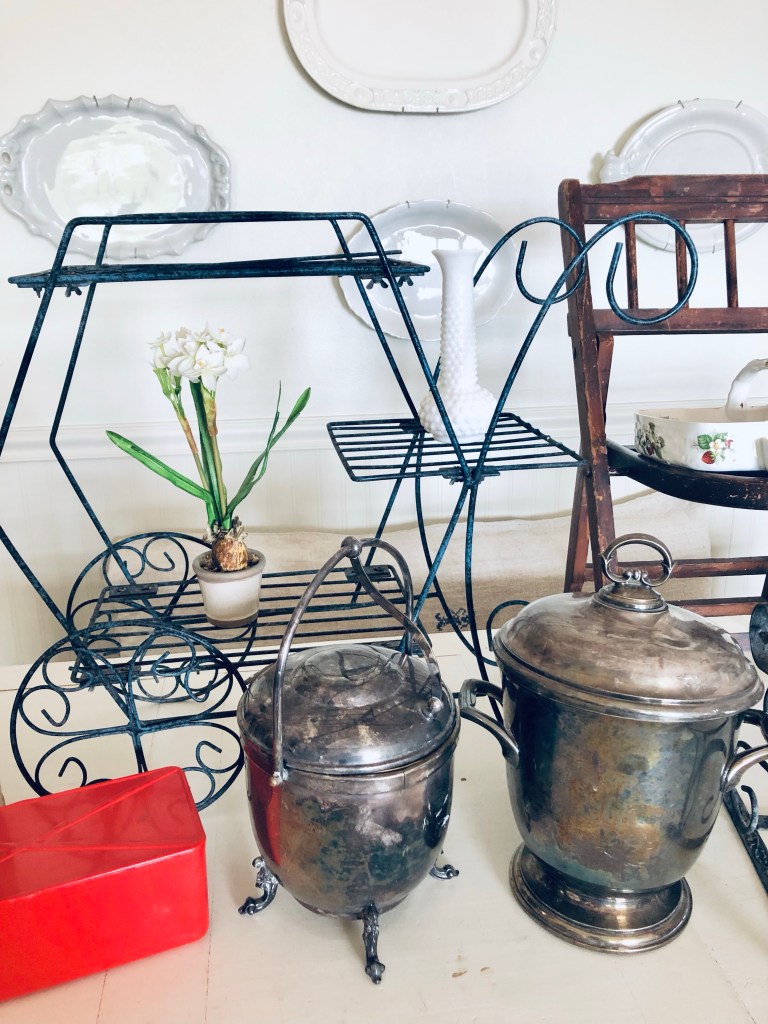 Todays thrift haul ❤️ What’s your fav? Mine are the silver ice buckets! And that little antique folding chair?… I can’t with how cute it is!! #thrift #thrifting #thriftstorefinds #tuesdayvibes #deseretindustries #vintage #antiques #oldthings #oldthermos #icebucket #silver #handmedowncottage #furnitureattiffanys