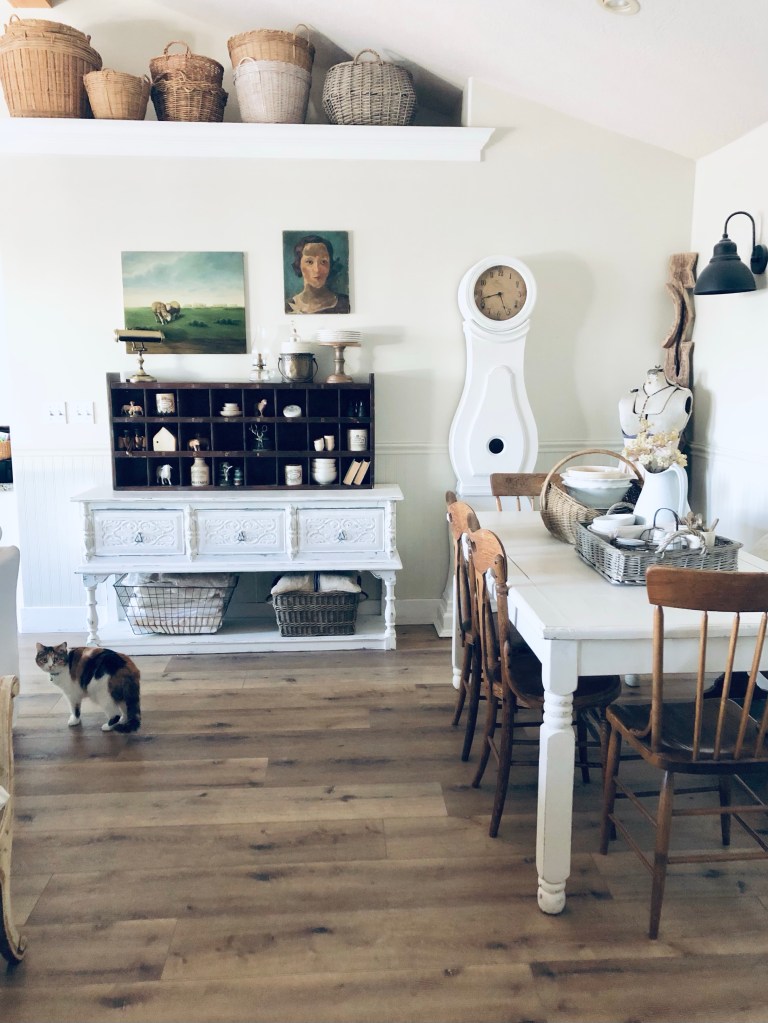 Good morning! Another week is upon us 🤍 #monday #morning #myfavoritetimeofday #steviethegirlkitty #homedecor #vintage #curated #found #antiques #diningroomdecor #moraclocks #ironstone #familypieces #art #handmedowncottage #furnitureattiffanys