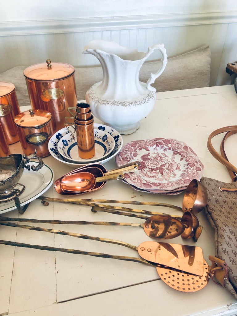 Todays thrift haul 🤍 It was a copper kinda day! What’s your fave? Mine is the owl 🦉 #handmedowncottage #furnitureattiffanys #thrifting #thriftstorefinds #deseretindustries #junking #vintage #copper #ironstone #dooneyandbourke #purse