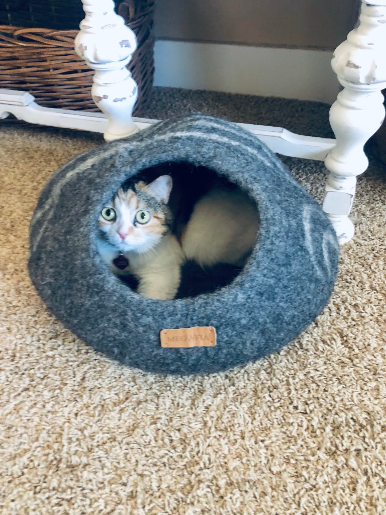 Stevie’s new bed 🤍 #steviethegirlkitty #newbed #catsofinstagram #catlover #calicocat #ithinkshelikesit #handmedowncottage #furnitureattiffanys