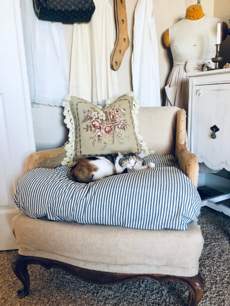 Good morning 😻 #steviethegirlkitty #cats #timetowakeup #catsofinstagram #comfy #vintage #chair #homedecor #thriftstorefinds #wednesday #handmedowncottage #furnitureattiffanys