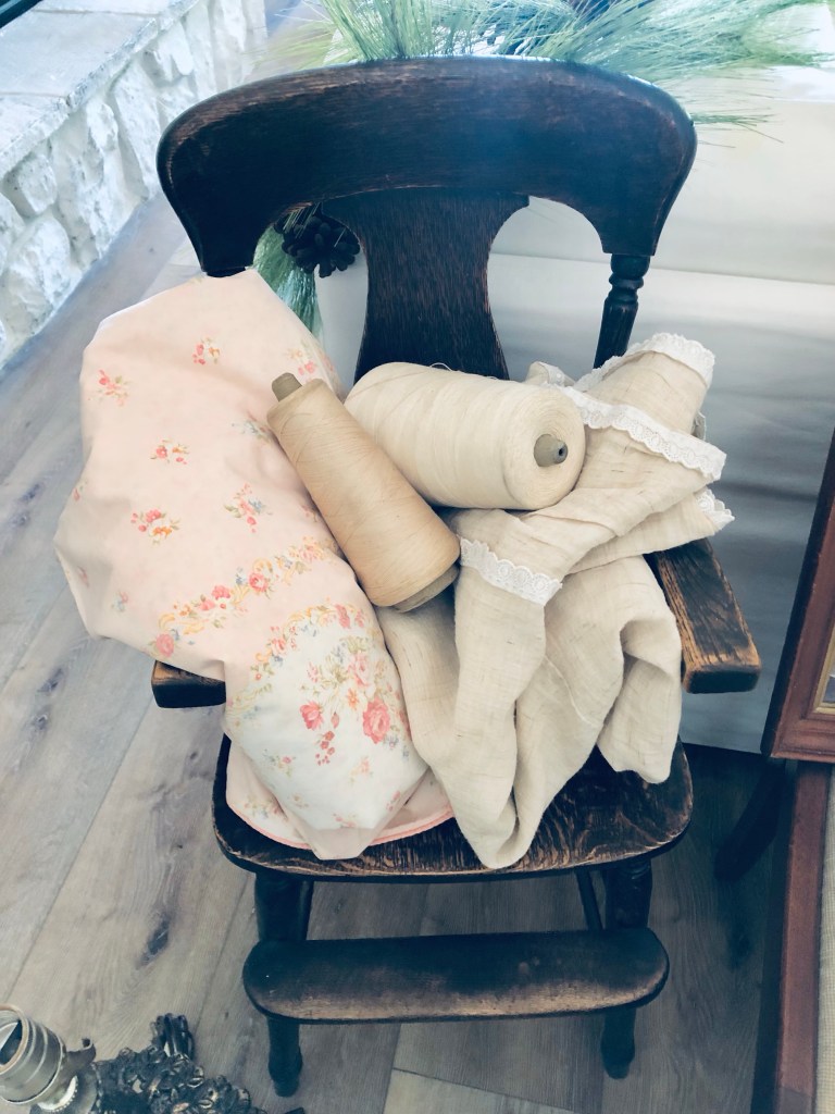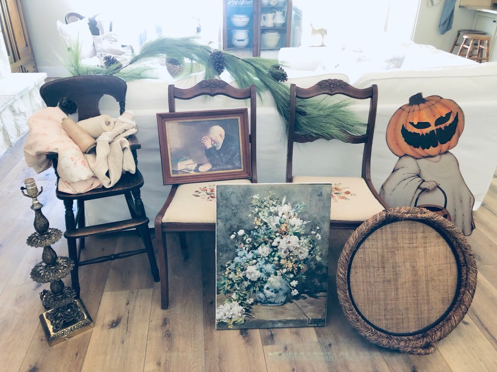 Todays thrift haul… what would be your fav? Mine is the antique high chair 🤍 #thrifting #thriftstorefinds #deseretindustries #difinds #antiquechair #linens #baskets #halloweendecor #christmasdecor #art #handmedowncottage #furnitureattiffanys
