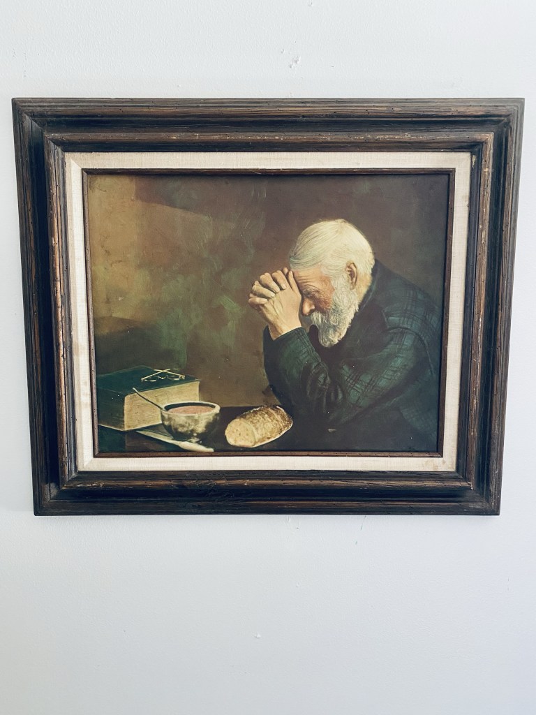 When I found this sweet antique framed print thrifting the other day, I was so excited! I’ve seen it in a few homes and I’ve always been drawn to it. This is some info I found out about it…”Back in 1918 an old man with footscrapings to sell, stopped at the photography shop of Eric Enstrom at his studio/home in the tiny mining town of Bovey, Minnesota. Enstrom invited him in and offered him some food. The old man was so thankful, he bowed his head in a prayer of thanks. To this day, this picture is loved throughout the entire world. After his visit, nobody ever saw this old man again. He is thought to have died in Missouri.” How sweet is that? 🤍#oldprint #loveit #kindness #thankfullness #prayer #thrifted #vintage #antique #handmedowncottage #furnitureattiffanys
