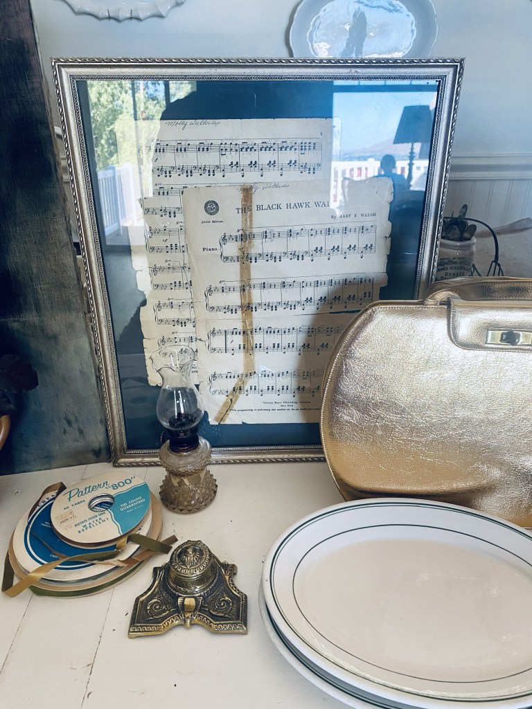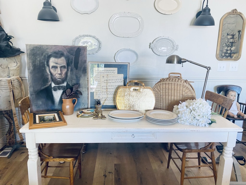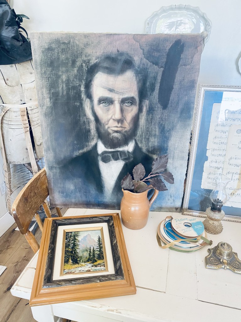 Today’s haul… not huge, but I found a few fun things 🤍 what would be your fav? Mine is the Abraham Lincoln chalk painting. It’s on velvet! Super fun for Halloween 🎃 #halloween #thriftstorefinds #deseretindustries #vintage #antique #oldribbon #abrahamlincoln #art #handmedowncottage #furnitureattiffanys