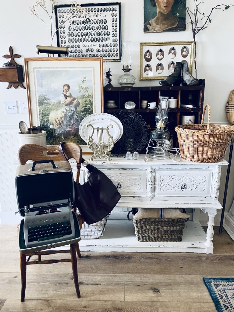 Today’s thrift haul 🤍 What would be your fav? Mine is the typewriter #thriftstorefinds #deseretindustries #vintage #antique #crock #art #dooneyandbourke #handmedowncottage #furnitureattiffanys #vintagetypewriter