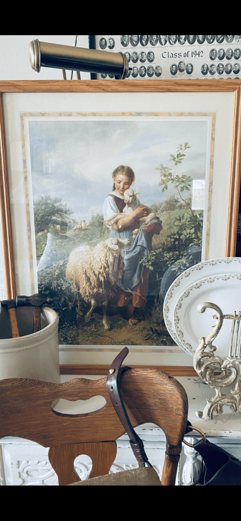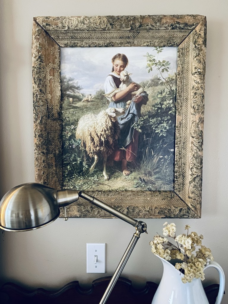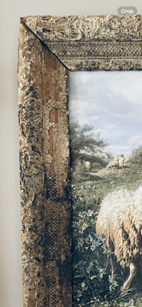 I thrifted this framed print yesterday… I hated the frame. It screamed 1990 haha! I knew I had the perfect frame for it home! So I pulled it out and cut it to fit my frame 🤍 What do you think? #thriftedart #sheep #antiqueframe #repurposed #thritedfinds #handmedowncottage #furnitureattiffanys