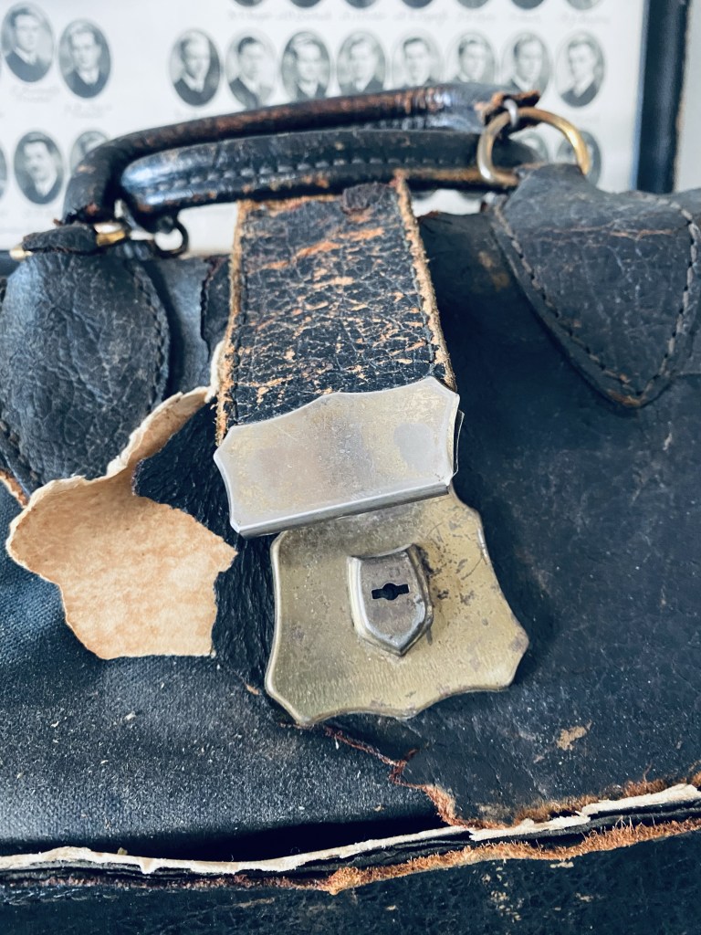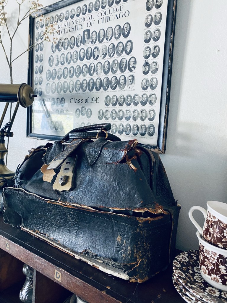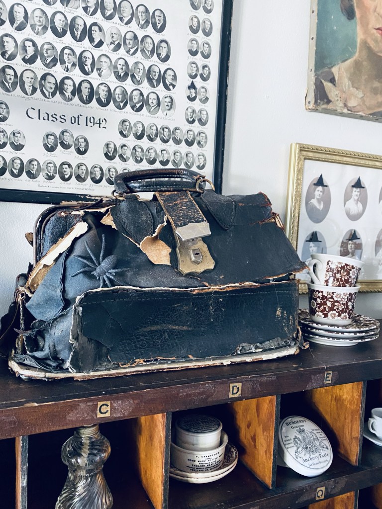My sweet antique Drs bag that I got at #fleaology on Saturday has seen better days 🖤 But can you imagine the things she has seen? After some mending, she can sit semi upright… and she adds the perfect touch to my Halloween decor 🖤 #halloweendecor #antiquedrbag #old #tattered #history #happymonday #handmedowncottage #furnitureattiffanys