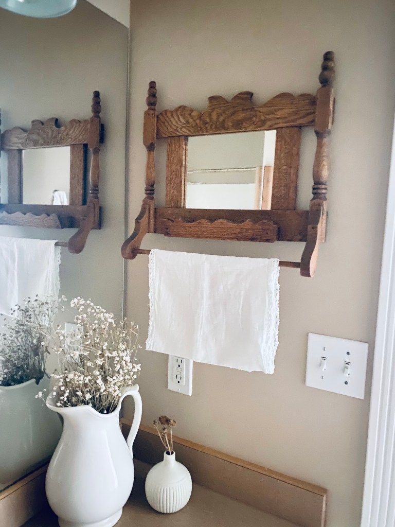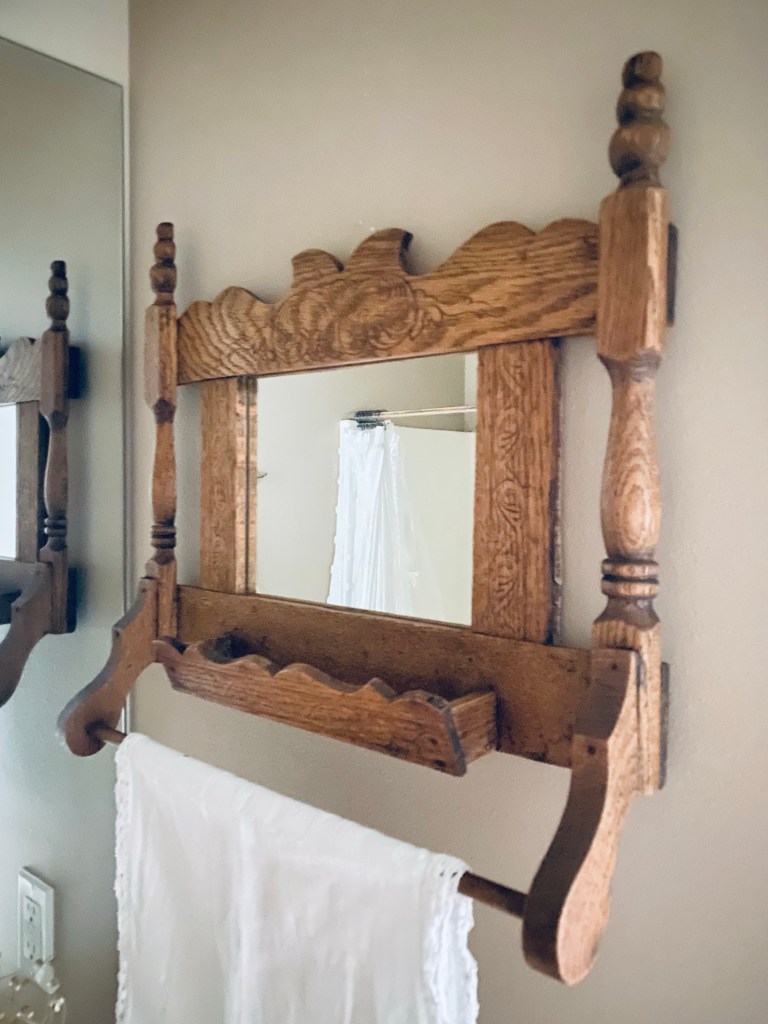 My sweet antique shaving mirror and towel holder I got at #fleaology23 last weekend 🤍 She works perfectly in my hall bathroom 🤍 #antique #shavingmirror #old #fleamarketfinds #powderroom #ironstone #bathroomdecor #handmedowncottage #furnitureattiffanys