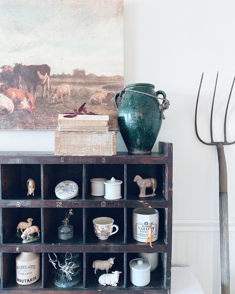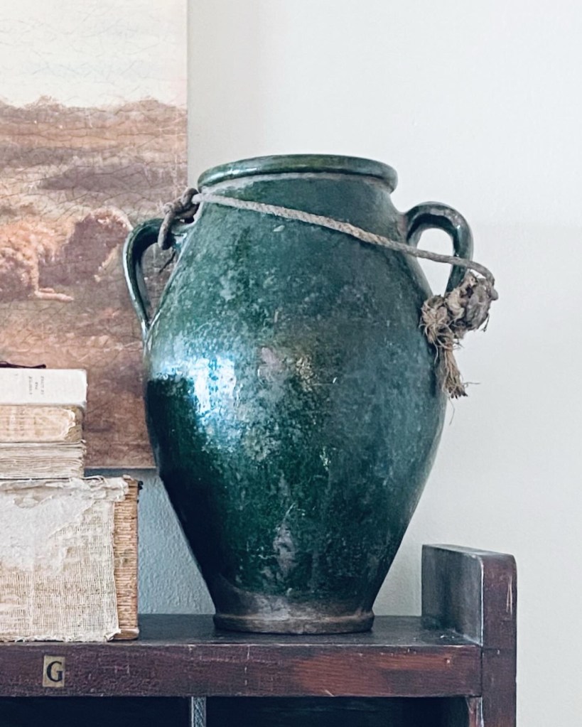 Good morning! This antique olive jar I found thrifting yesterday has my heart! Isn’t she a beauty? #antiqueolivejar #old #thrifted #green #stoneware #oldrope #styled #antique #homedecor #handmedowncottage #furnitureattiffanys