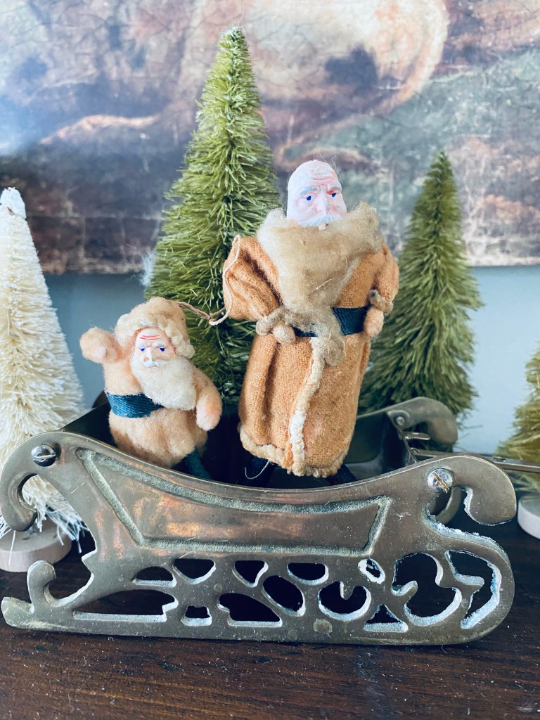 Happy Saturday 🎅🏻 Aren’t these old Santa’s a hoot? One is missing his hat and the other looks like he’s doing the “Elaine dance” from Seinfeld #antiquesanta #christmasdecor #christmas #brass #vintagechristmas #happysaturday #theymakemesmile #handmedowncottage #furnitureattiffanys #seinfeld