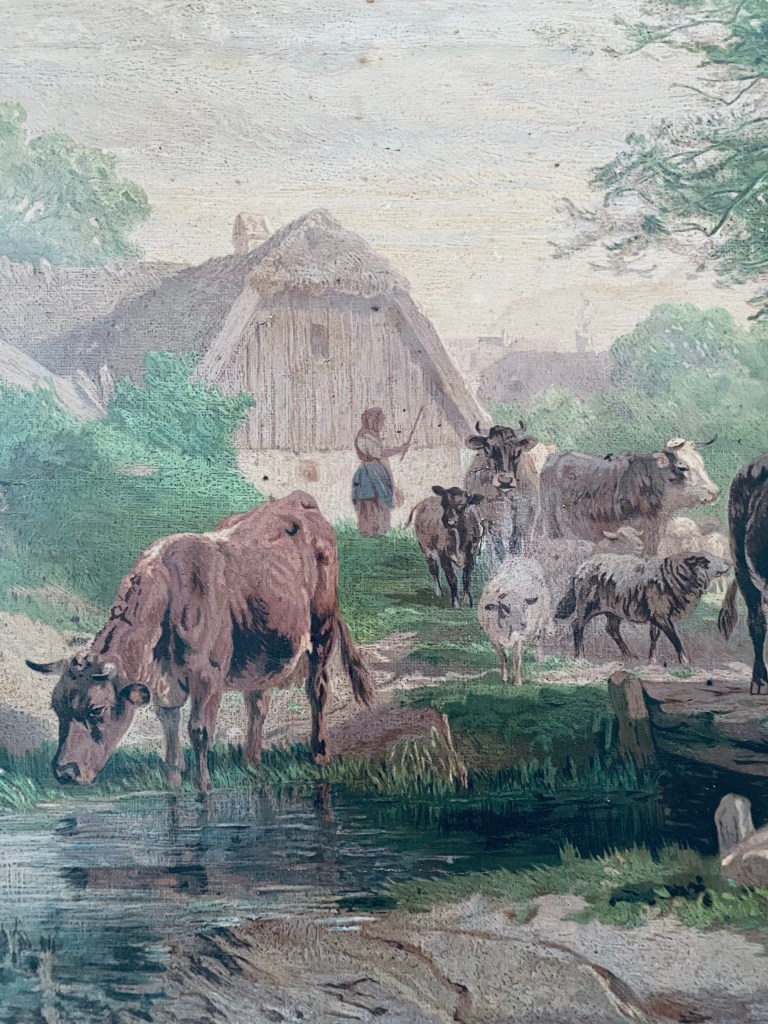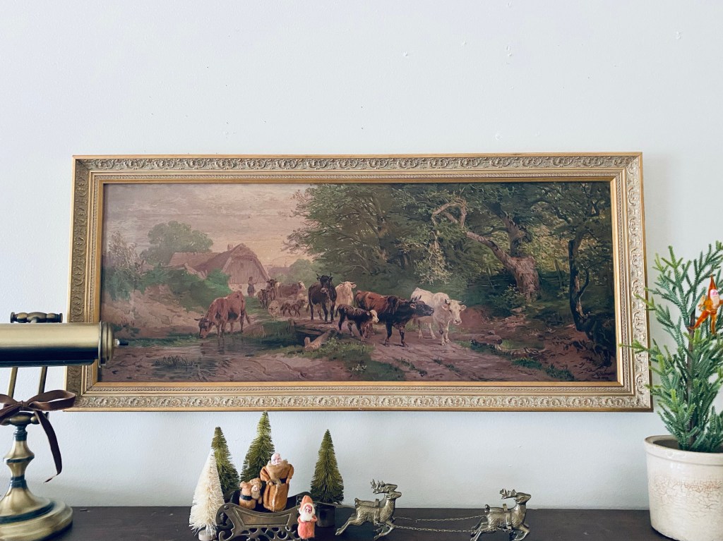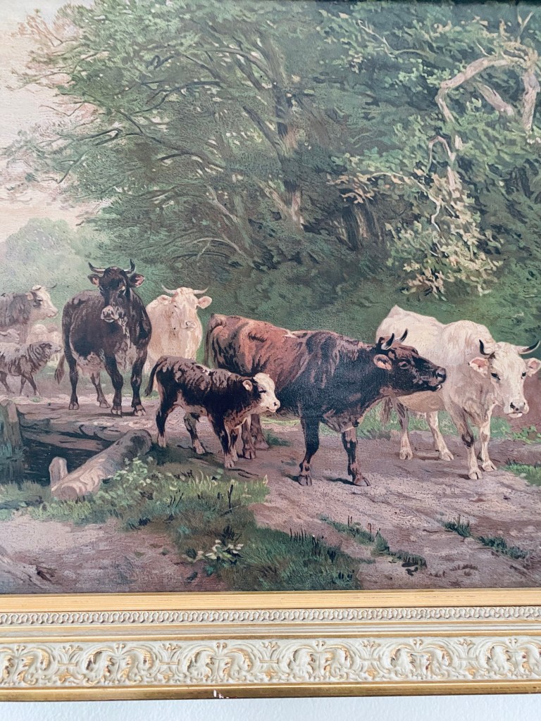 I found the sweetest old framed print today at @moonglassantiques I had never been in and ohhh my goodness! What a beautiful store! I could’ve stayed for days and boughten everything! #pastural #cows #print #antique #vintage #antiquestore #loveit #happysaturday #handmedowncottage #furnitureattiffanys #farmhouse