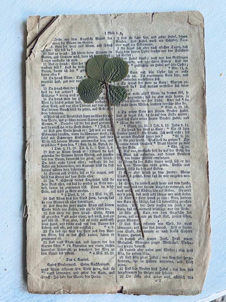 Another antique bible has been added to my collection 🤍 But this one is in German… 1912. I was delighted to find all kinds of treasures within her pages… dried flowers, hand written notes and this 4 leaf clover 💚 I think it deserves a frame… don’t you? 💚 #antique #antiquebible #german #loveit #bible #collection #1912 #handmedowncottage #furnitureattiffanys