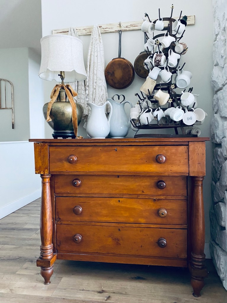 Everything in this picture was thrifted… with the exception of the French bottle drying rack 🤍 Even the dresser! Even if I were a millionaire…. I’d still go thrifting! It’s way more exciting to me to find a treasure that has had a past life, than to find a brand new item 🤍 #thrift #thriftstorefinds #thrifted #deseretindustries #thriftingmakesmehappy #iwillalwaysthrift #antiques #vintage #antiquefurniture #frenchdryingrack #ironstone #ironstonecrushin #creamercollection #handmedowncottage #furnitureattiffanys