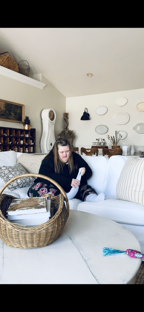 Leah getting her socks on to go to the mall 🤍 She wasn’t happy when she discovered I was filming her ha! Sweet girl! #downsyndromeawareness #downsyndrome #loveher #smartgirl #gettingready #goingshopping #happysaturday #handmedowncottage #furnitureattiffanys #enjoytheride