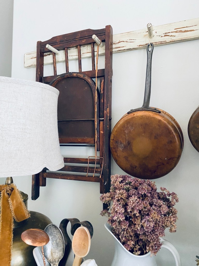 This tiny folding chair has my heart 🤍 I love it hanging on my peg rack! I love changing decor around… I think it’s my therapy #therapy #thrifted #foldingchair #childsize #antique #decor #vintage #ironstone #handmedowncottage #furnitureattiffanys