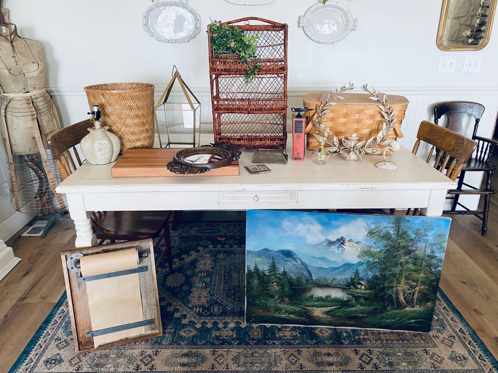 Today’s thrift store finds ❤️ What would be your fav? I adore the painting!! #thriftstorefinds #thrifting #vintage #antiques #handmedowncottage #furnitureattiffanys
